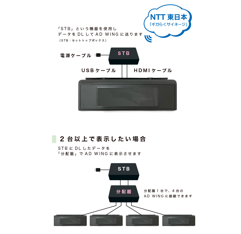 NTT東日本と業務提携。「ギガらくサイネージ」と連携し遠隔地から複数台への配信が可能。