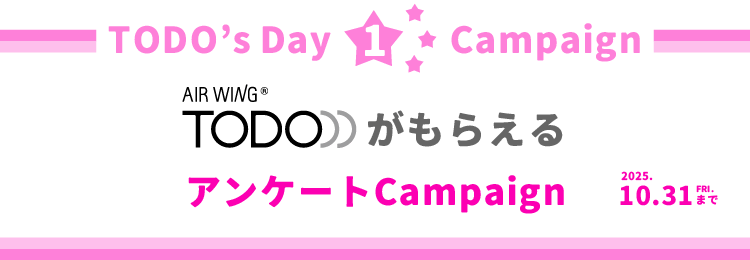 AIR WING TODO発売より1周年を記念し、感謝の気持ちを込めて記念キャンペーンを開催いたします。楽しくアンケートに答えて賞品をGETしてください!