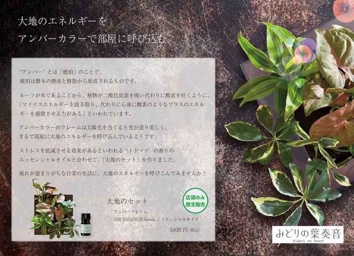 セット内容:アンバーフレーム(苗付き)×1、AIR ESSENCE Green エッセンシャルオイル×1