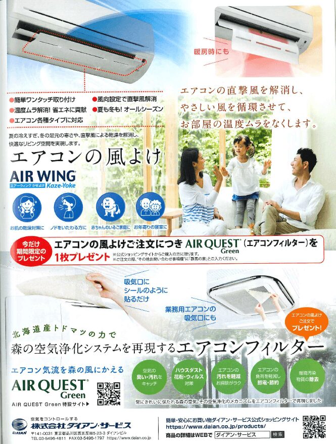 この度、ニューズ・ライン出版「群馬の家」に、エアコンの風よけ「AIR WING Kaze-Yoke」とエアコン用フィルター「AIR QUEST Green(エアークエストグリーン)」が掲載されました。