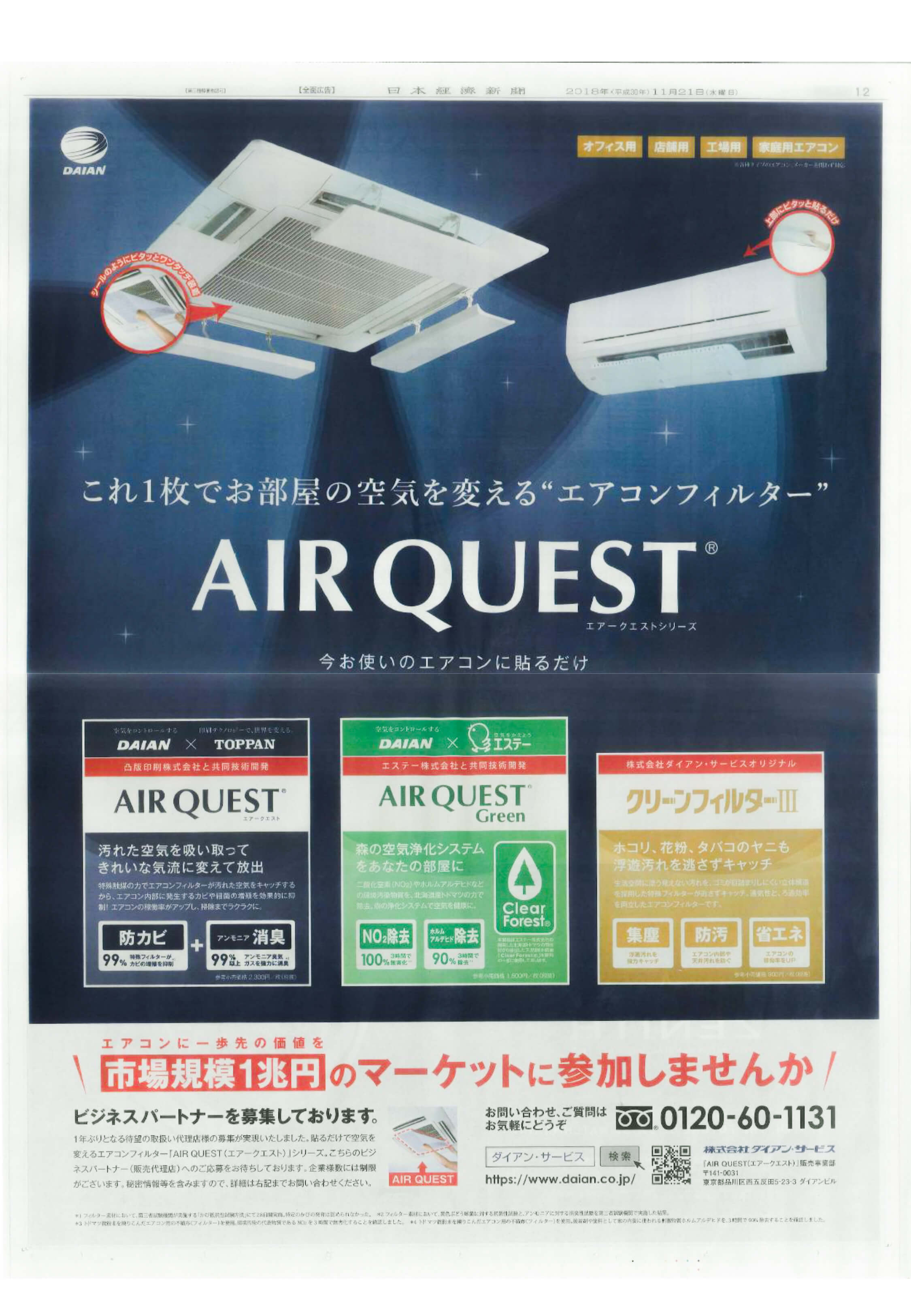 エアコン用フィルター「エアークエストシリーズ」プロモーションの一環として、下記の通り広告の掲載を行います。