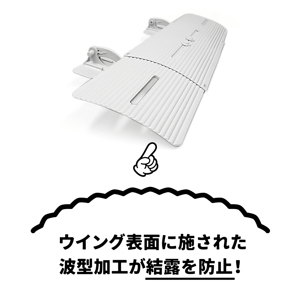 ウイング表面に施された波型加工は凸凹のすきまに空気の膜をつくり、表裏の温度差を緩和して結露を防止します。