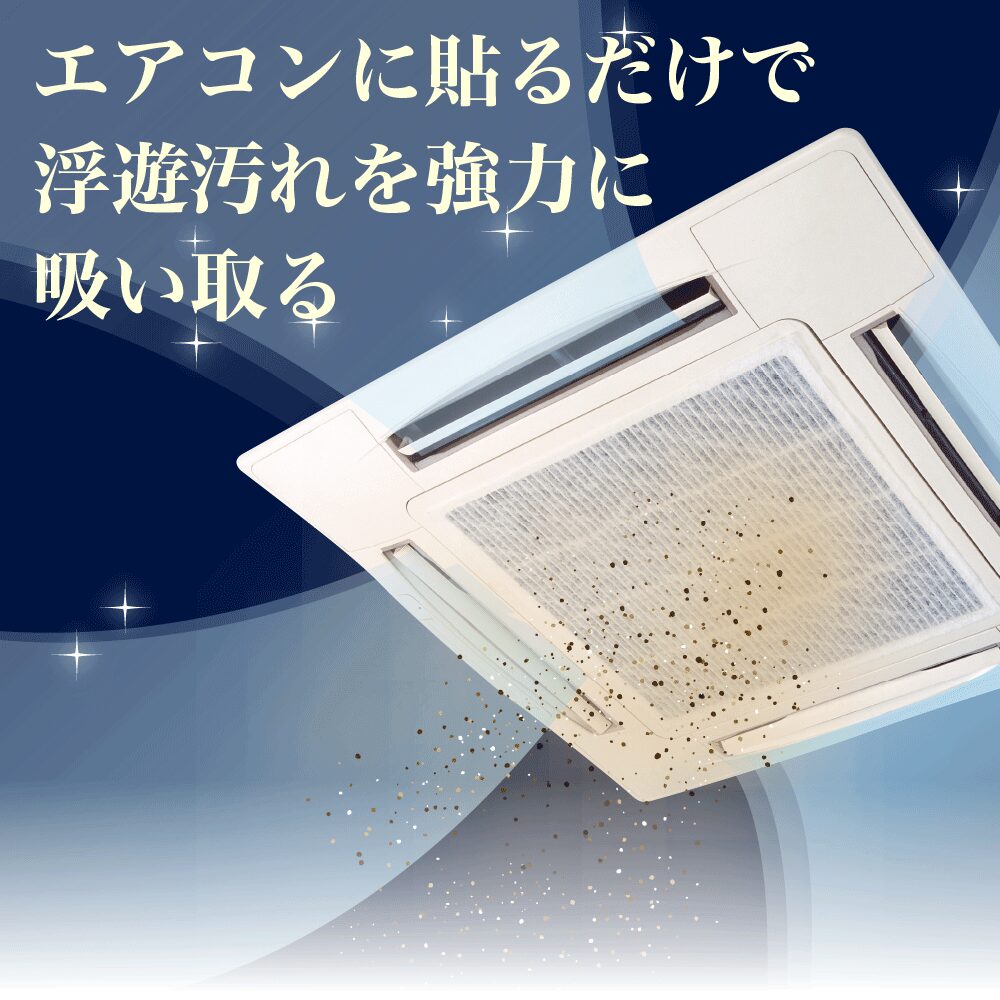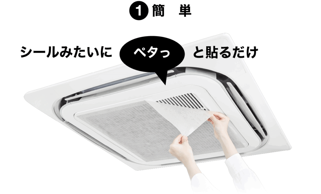 オフィスや店舗・施設、自宅の生活空間などに漂うホコリや花粉。そんな見えない汚れを「クリーンフィルター」が効果的にキャッチ。エアコンに貼るだけで、室内の空気は驚くほどキレイに変わります。