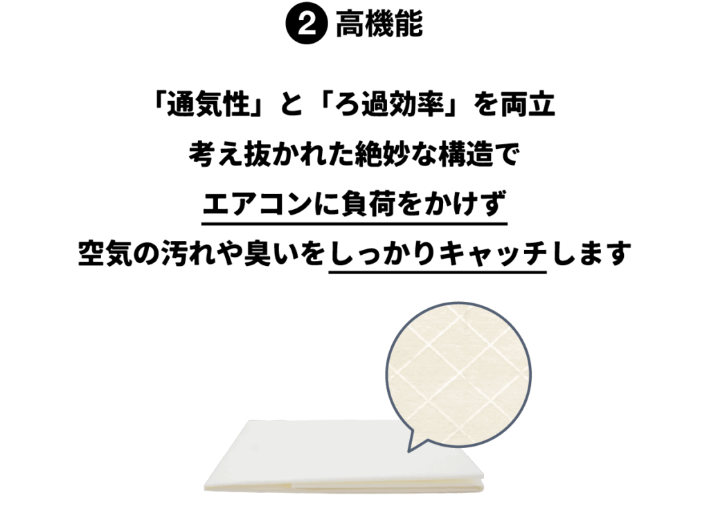 ホコリや花粉などの汚れをしっかりキャッチ。目詰まりしにくい立体構造で、通気性が落ちません。