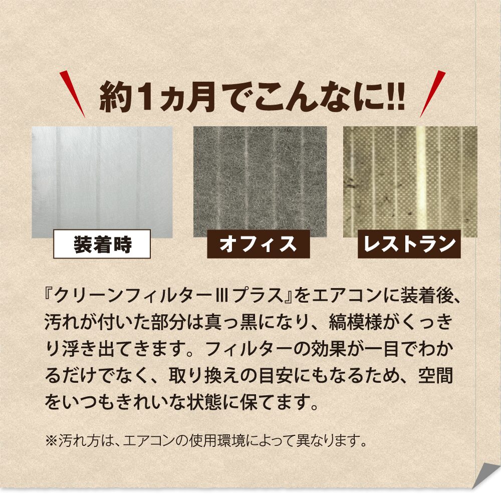 汚れてくっきりと模様が出てきたら貼り替えのサイン。フィルターの効果が一目でわかり、貼り替え目安になるため、空間をいつもキレイな状態に保てます。