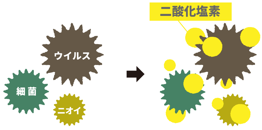 空間に浮遊していたり物体に付着するウイルス、細菌、ニオイを、二酸化塩素が高い酸化力で抑制。