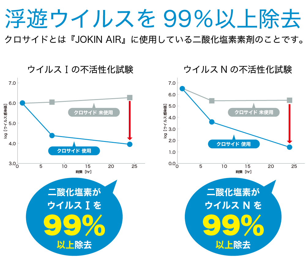 二酸化塩素は安定して発生しています。エアコンの気流がない場合でも、空気より重いという二酸化塩素の性質を利用して頭上から効果は発揮されます。24時間の効率的な空間除菌を可能にするのが、『JOKIN AIR』なのです。