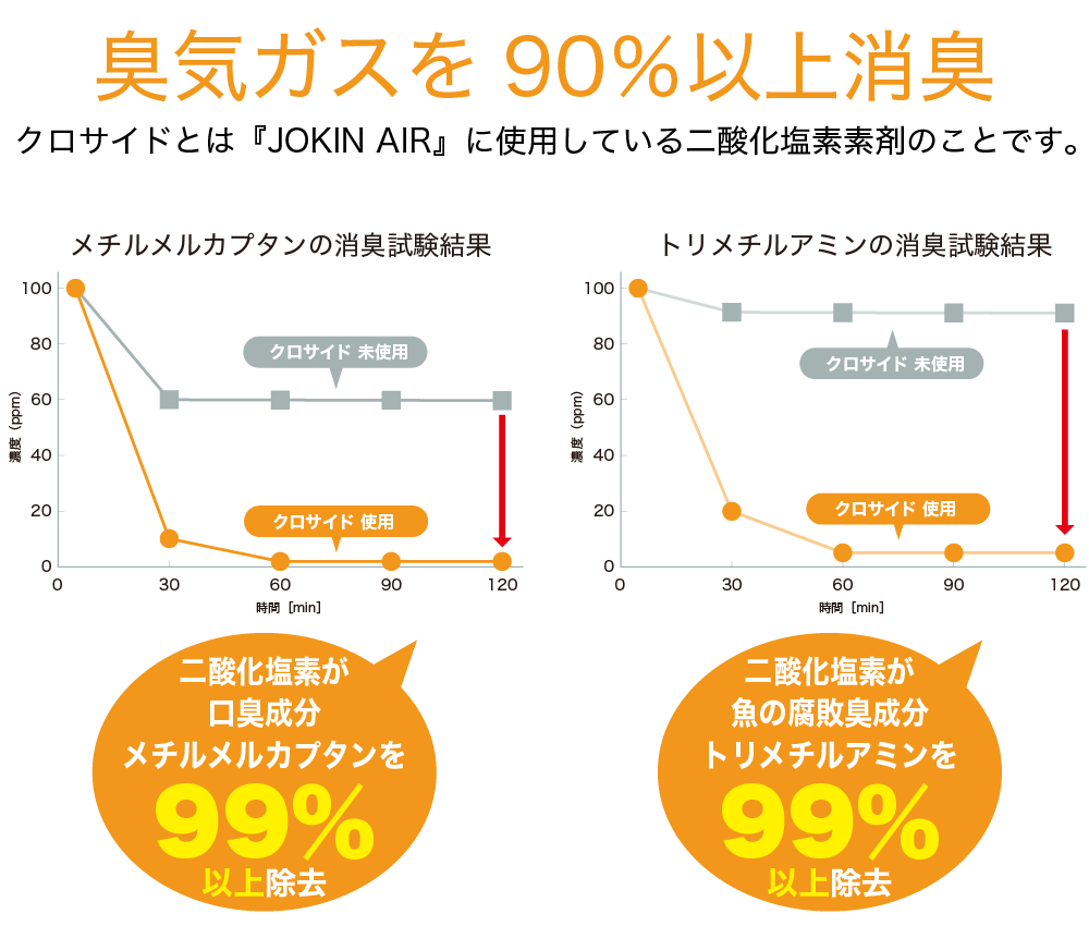 などで安全性を認められた薬剤です。また、『JOKIN AIR』で使用している顆粒タイプの二酸化塩素発生量は、日本二酸化塩素工業会の定める基準値を遵守しており、クリニックや保育園等での設置例もございます。